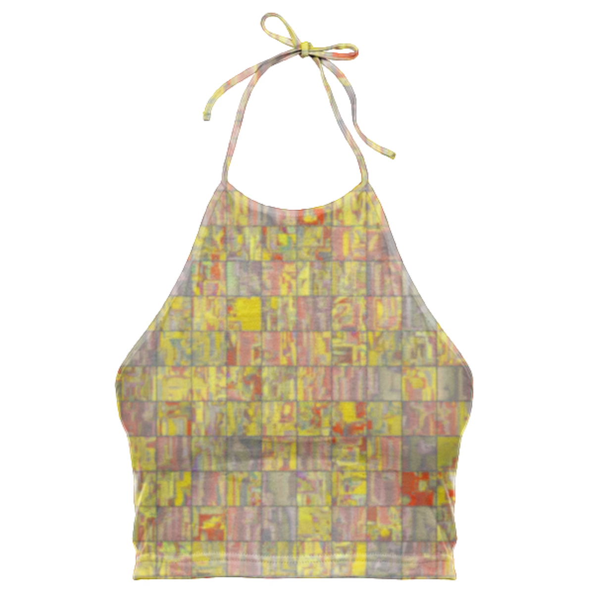 High neck halter top with adjustable ties. The back falls at the mid back and crops above the waist.