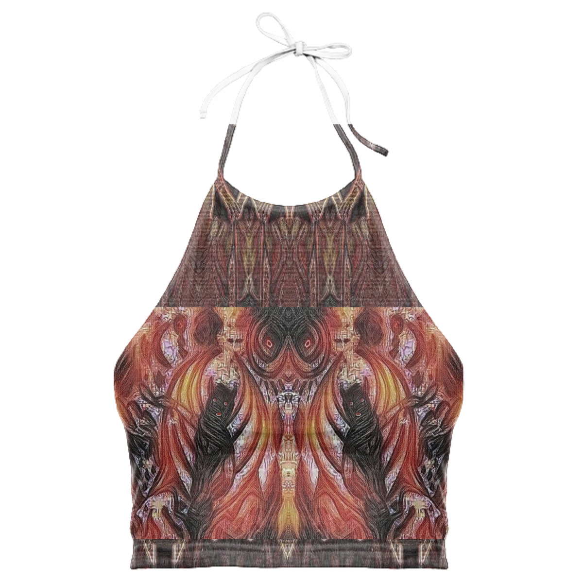 High neck halter top with adjustable ties. The back falls at the mid back and crops above the waist.