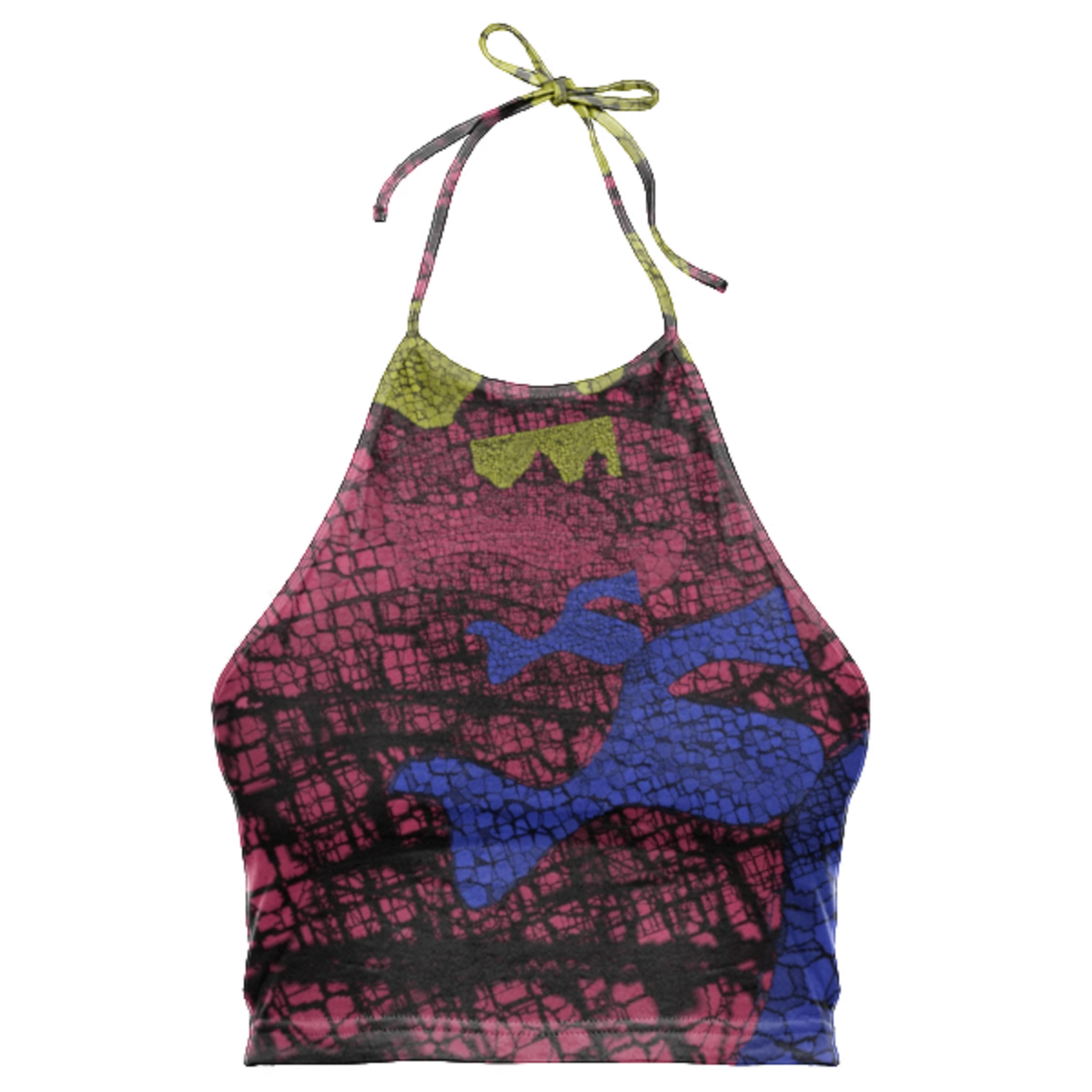 High neck halter top with adjustable ties. The back falls at the mid back and crops above the waist.