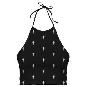 High neck halter top with adjustable ties. The back falls at the mid back and crops above the waist.