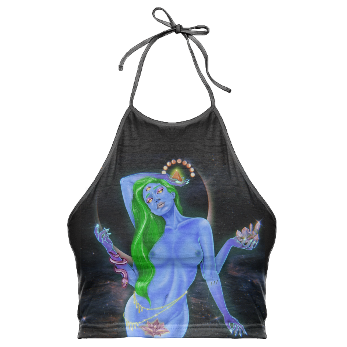 High neck halter top with adjustable ties. The back falls at the mid back and crops above the waist.