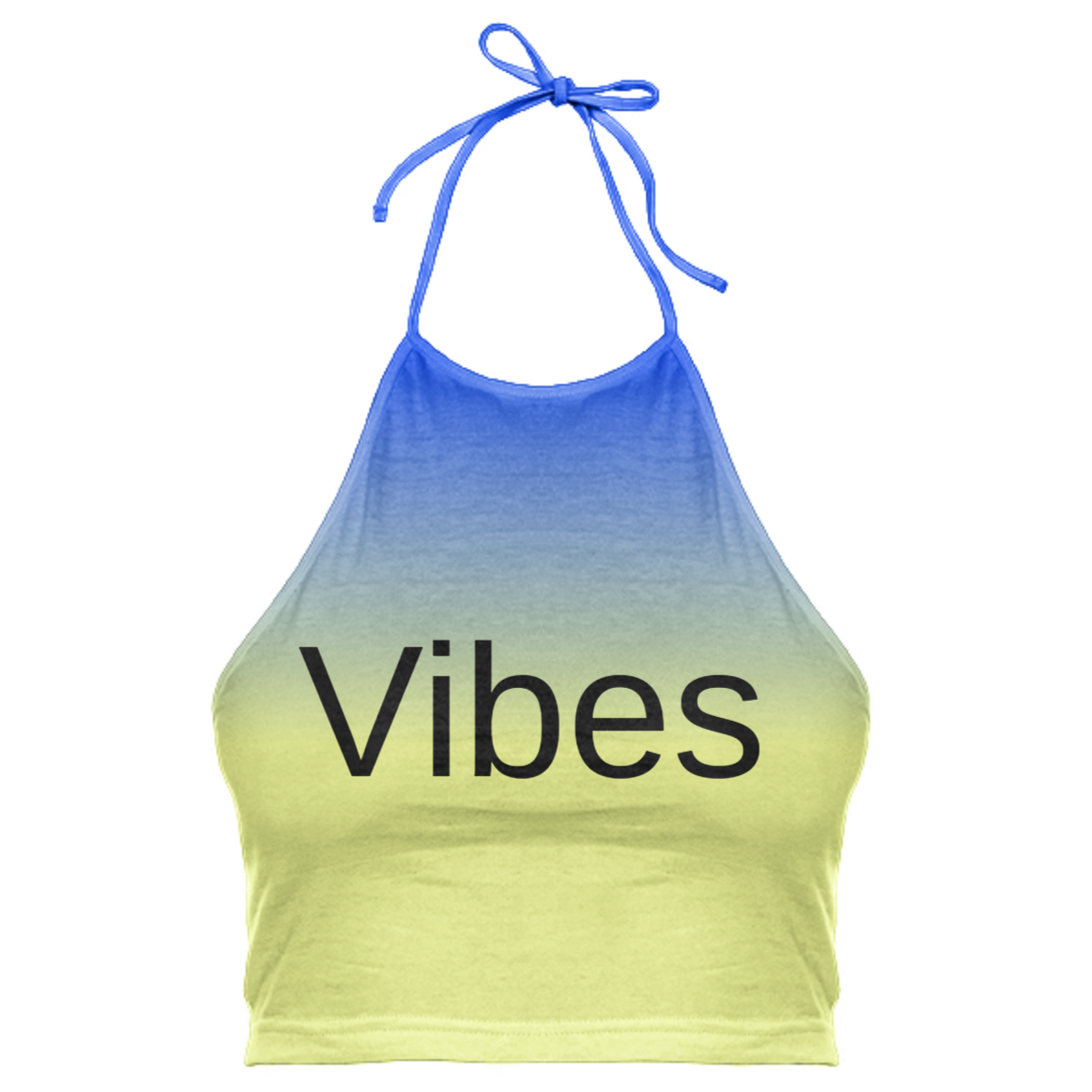High neck halter top with adjustable ties. The back falls at the mid back and crops above the waist.