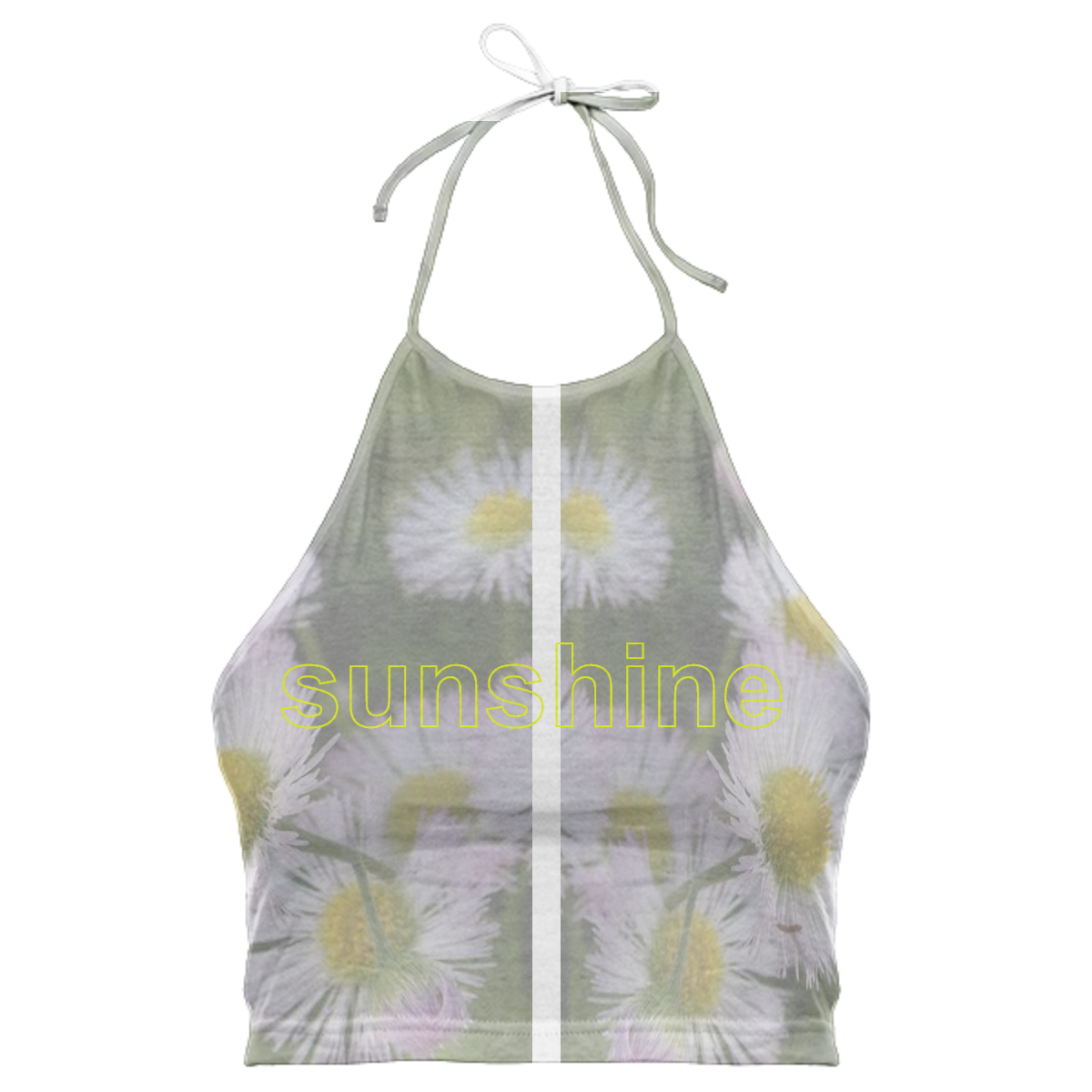 High neck halter top with adjustable ties. The back falls at the mid back and crops above the waist.