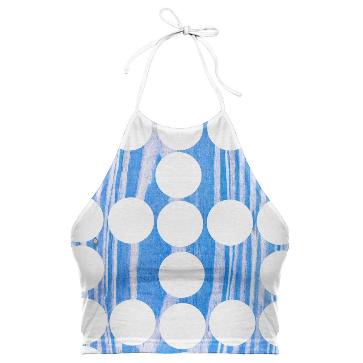 High neck halter top with adjustable ties. The back falls at the mid back and crops above the waist.