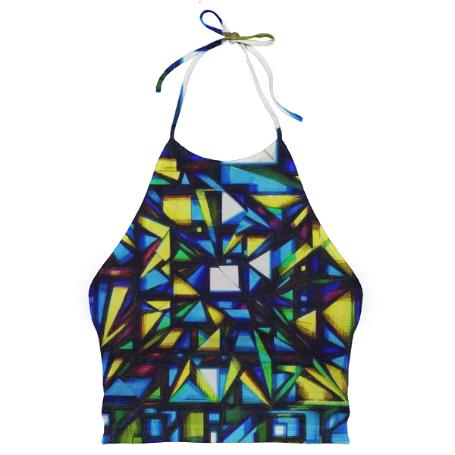 High neck halter top with adjustable ties. The back falls at the mid back and crops above the waist.