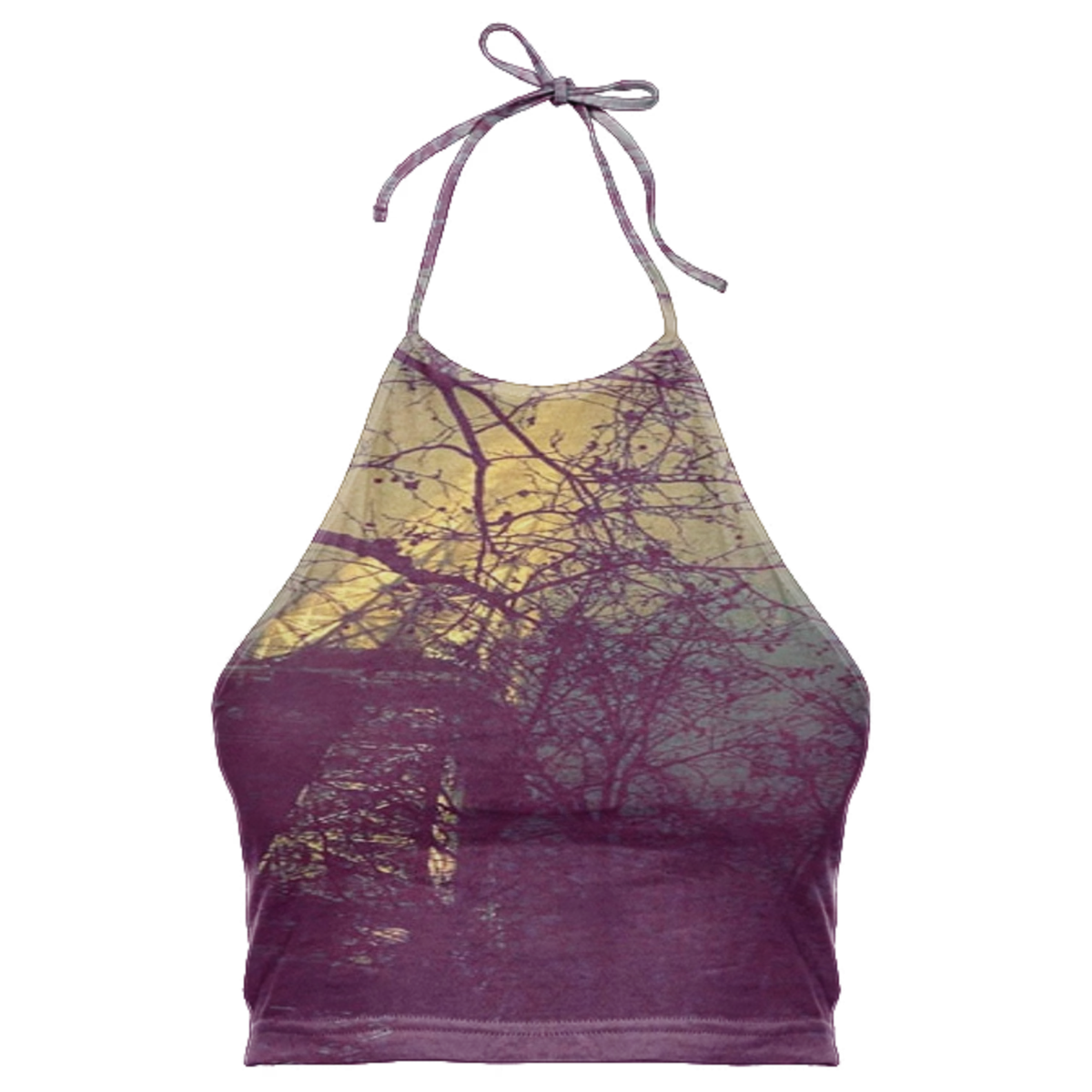 High neck halter top with adjustable ties. The back falls at the mid back and crops above the waist.