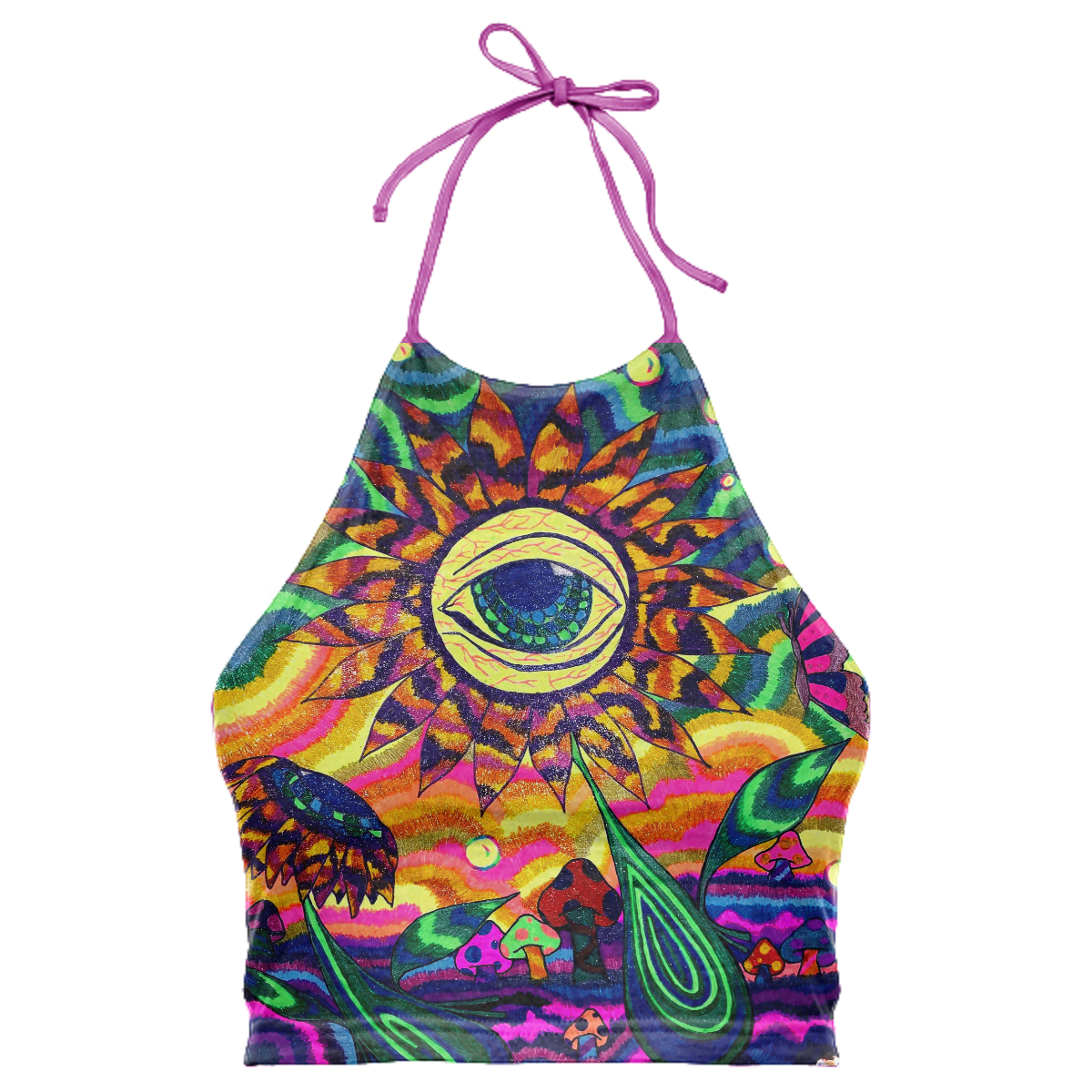 High neck halter top with adjustable ties. The back falls at the mid back and crops above the waist.