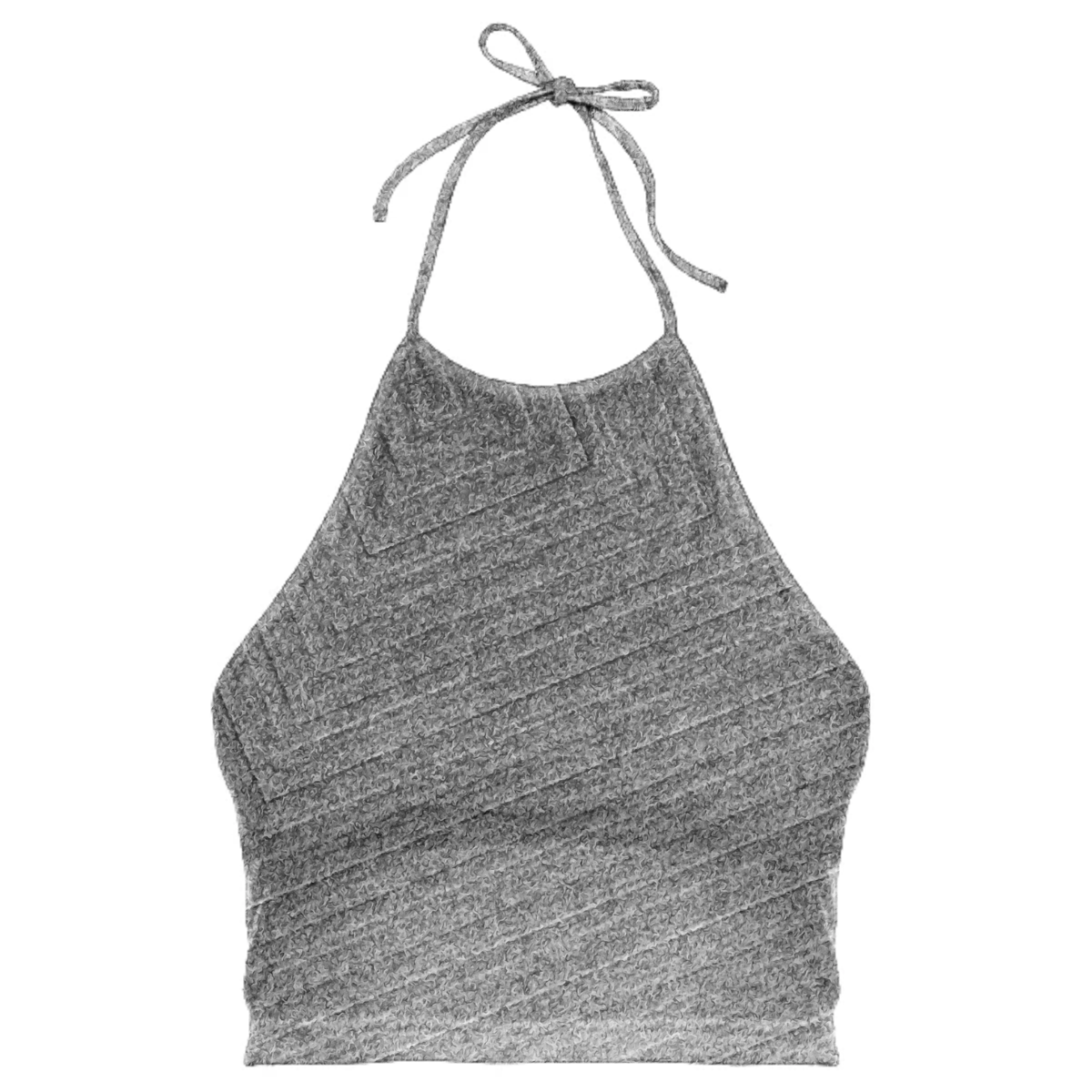 High neck halter top with adjustable ties. The back falls at the mid back and crops above the waist.