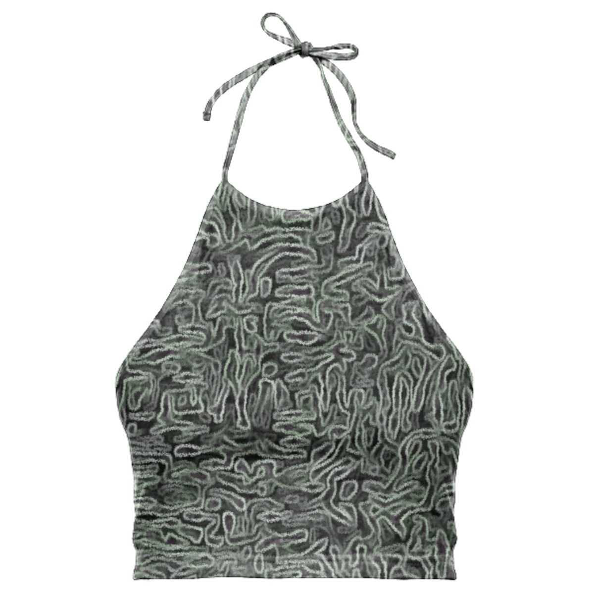 High neck halter top with adjustable ties. The back falls at the mid back and crops above the waist.