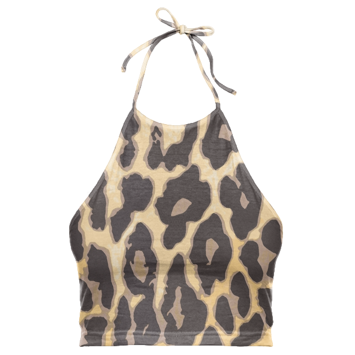 High neck halter top with adjustable ties. The back falls at the mid back and crops above the waist.
