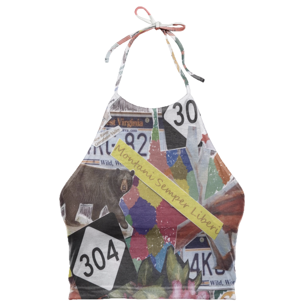 High neck halter top with adjustable ties. The back falls at the mid back and crops above the waist.