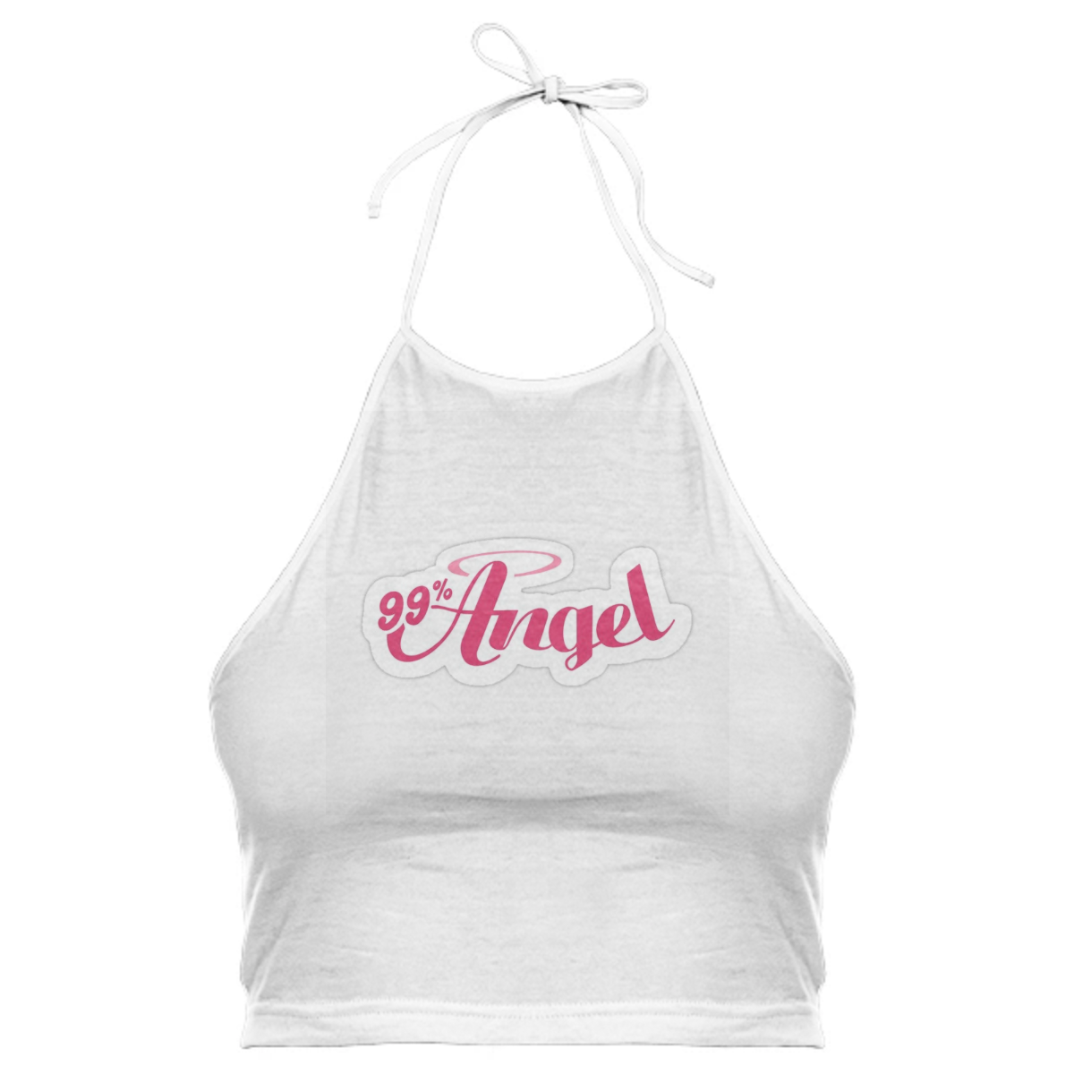 High neck halter top with adjustable ties. The back falls at the mid back and crops above the waist.