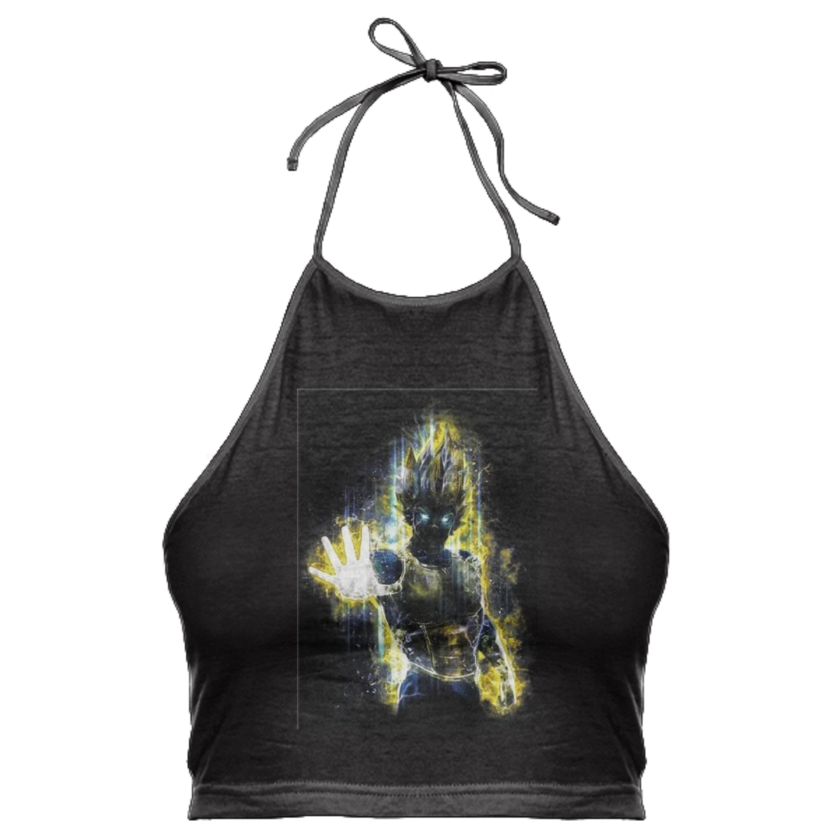 High neck halter top with adjustable ties. The back falls at the mid back and crops above the waist.