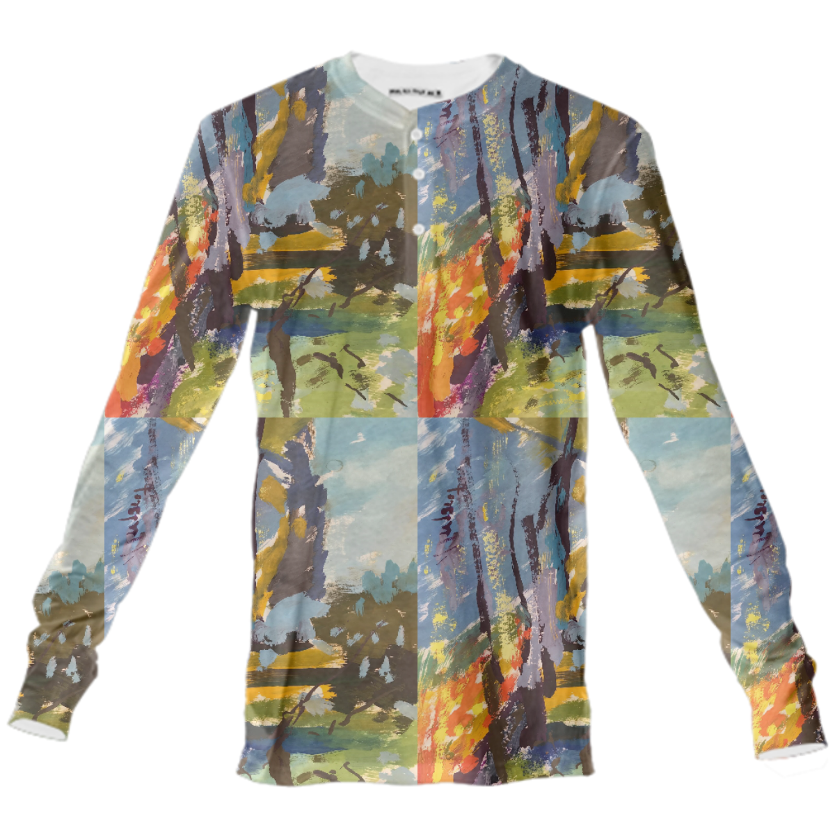 Classic crew neck cuffed henley shirt with front plastic buttons for comfort.