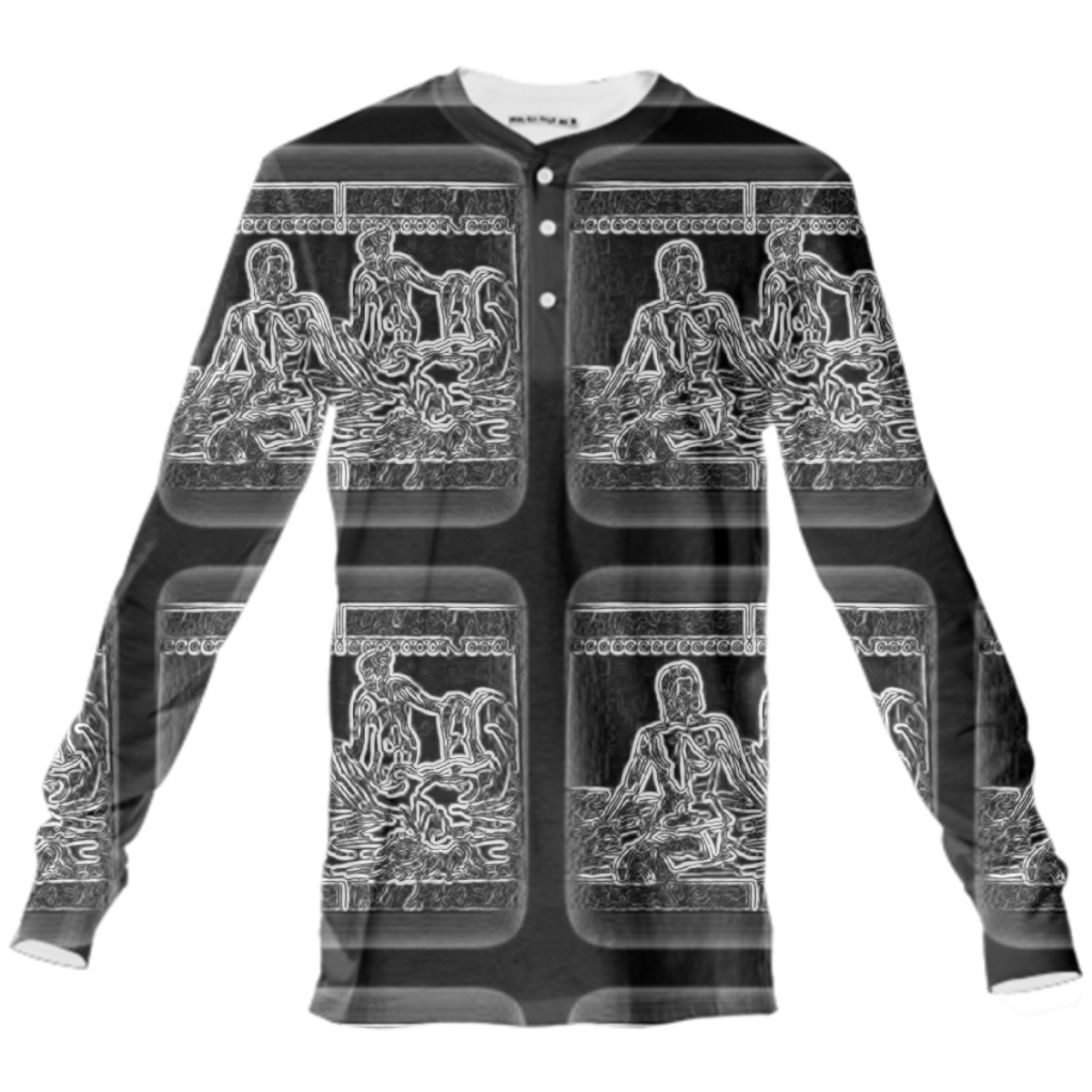 Classic crew neck cuffed henley shirt with front plastic buttons for comfort.