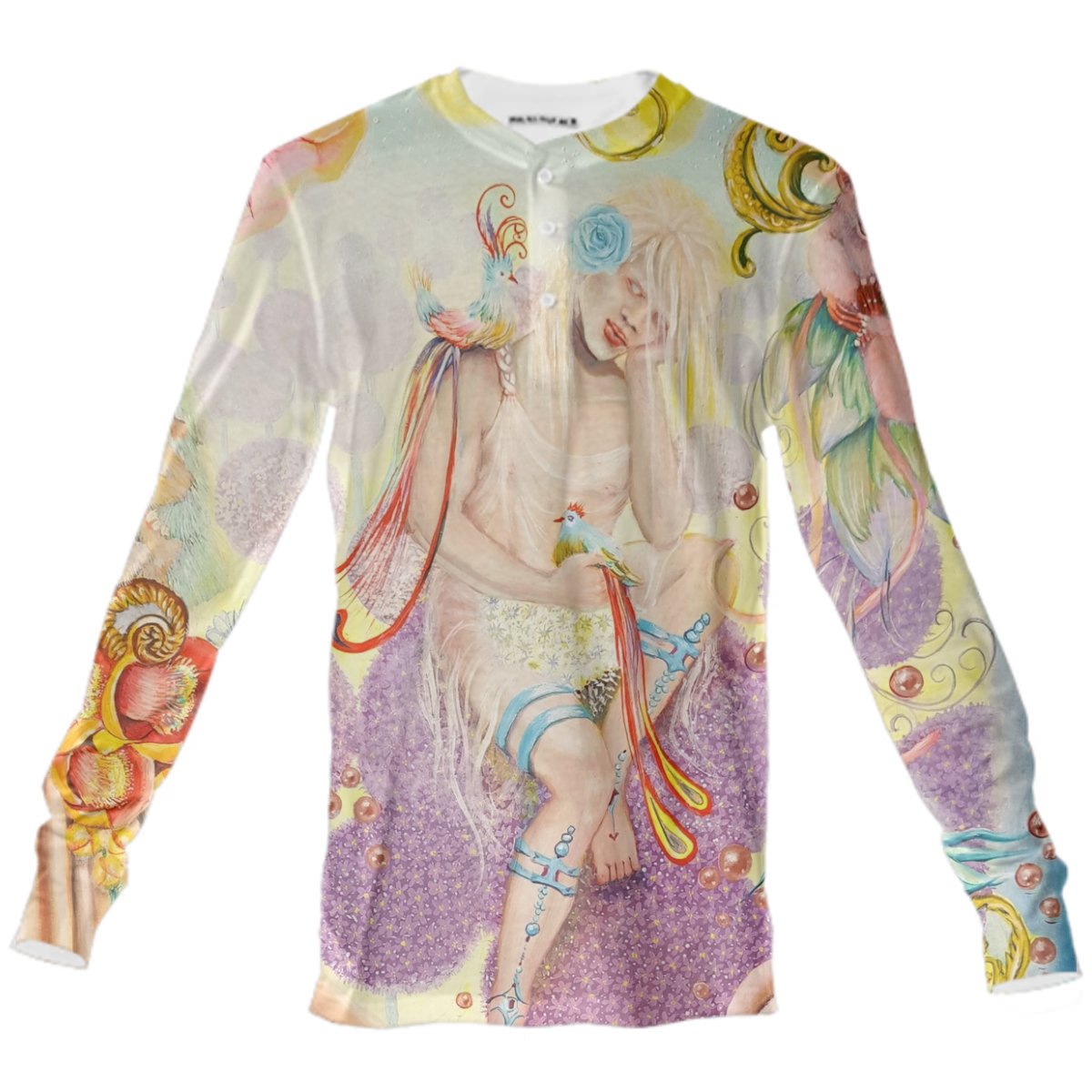 Classic crew neck cuffed henley shirt with front plastic buttons for comfort.