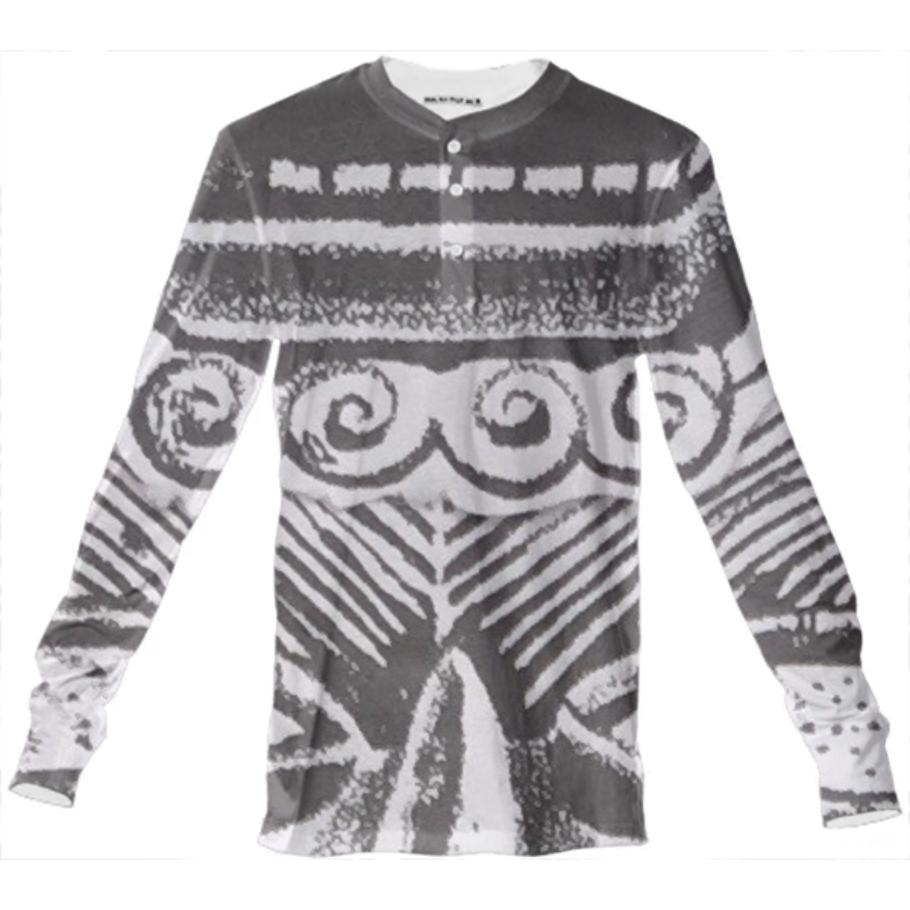 Classic crew neck cuffed henley shirt with front plastic buttons for comfort.