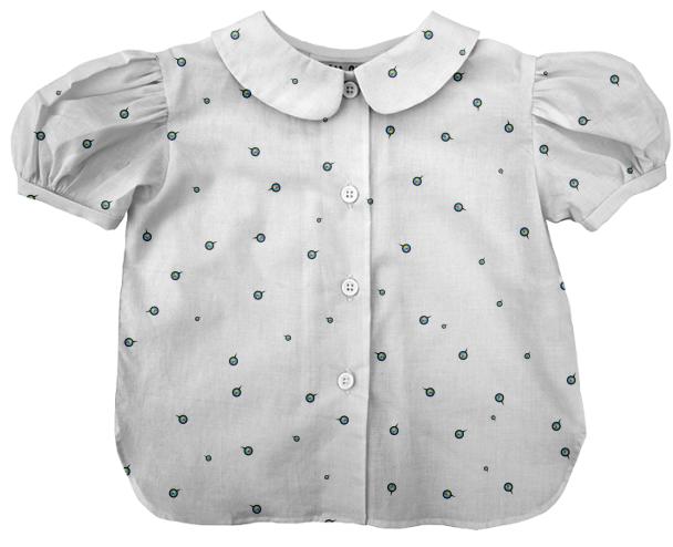 Sweet and simple button up kids blouse with peter pan collar and puff sleeves.