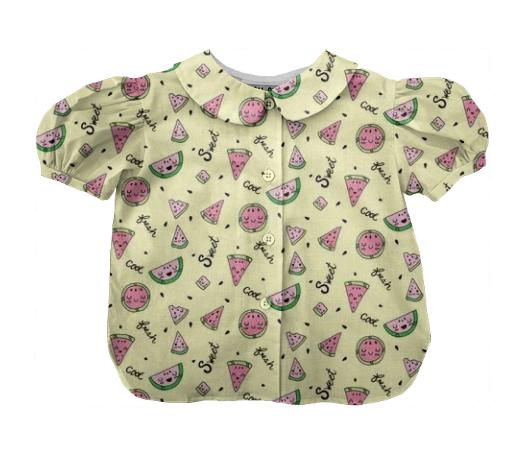 Sweet and simple button up kids blouse with peter pan collar and puff sleeves.
