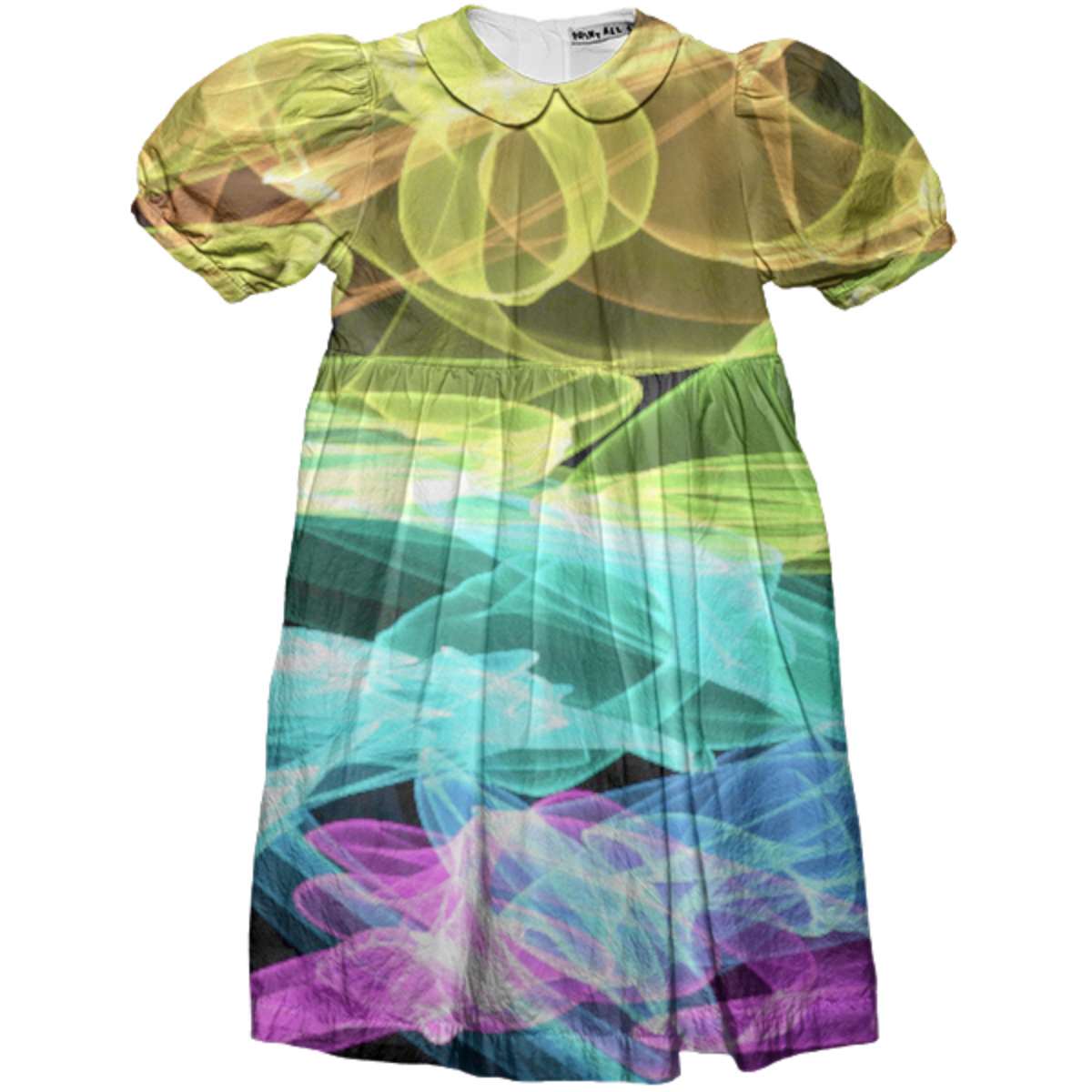 This kids party dress features a peter pan collar puff sleeves and empire waist with back bow tie. Easy to get on and off with center back plastic buttons.