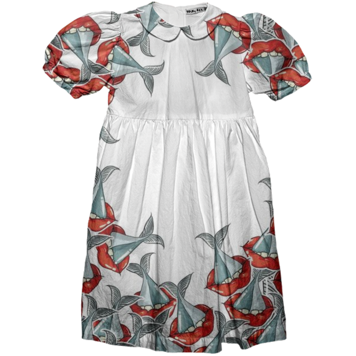 This kids party dress features a peter pan collar puff sleeves and empire waist with back bow tie. Easy to get on and off with center back plastic buttons.