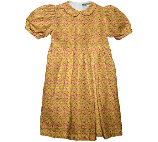 This kids party dress features a peter pan collar puff sleeves and empire waist with back bow tie. Easy to get on and off with center back plastic buttons.