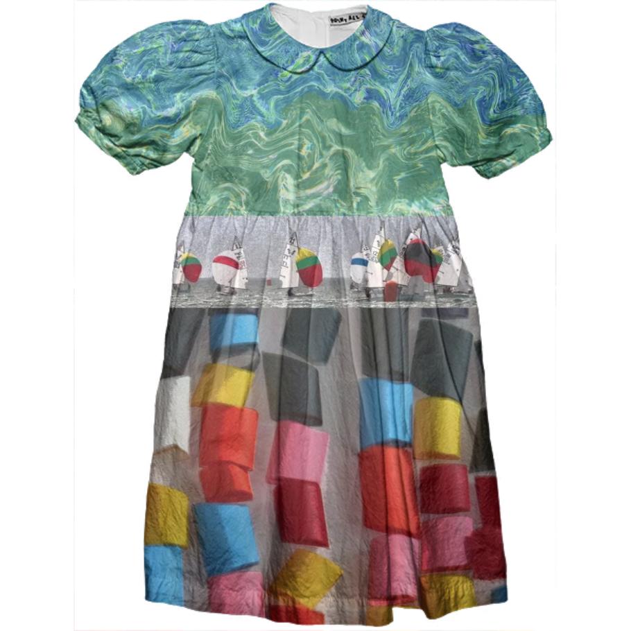 This kids party dress features a peter pan collar puff sleeves and empire waist with back bow tie. Easy to get on and off with center back plastic buttons.