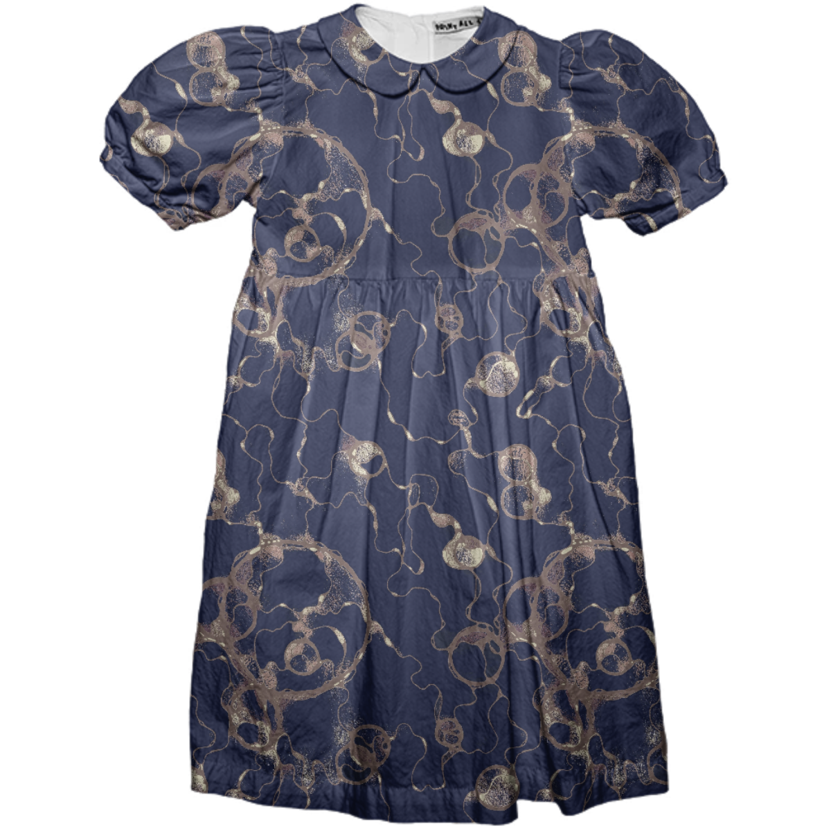 This kids party dress features a peter pan collar puff sleeves and empire waist with back bow tie. Easy to get on and off with center back plastic buttons.