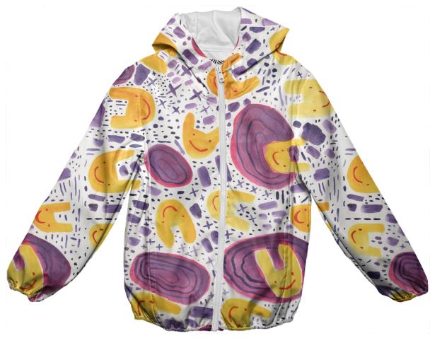 Kids rain jacket with a hood elastic sleeve cuffs & hem to keep out the rain and side pockets.