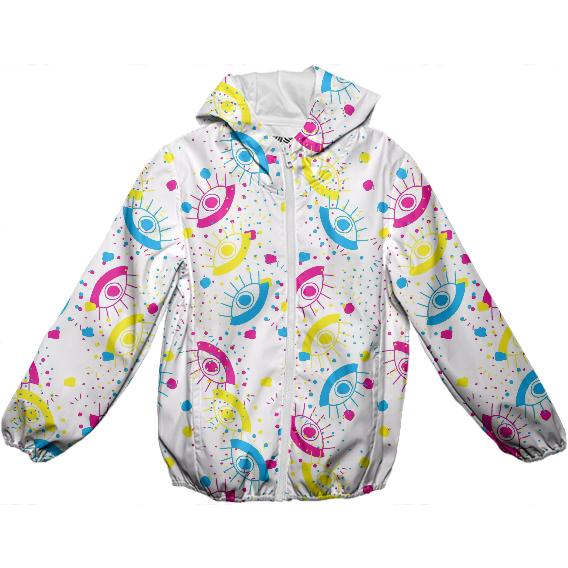 Kids rain jacket with a hood elastic sleeve cuffs & hem to keep out the rain and side pockets.