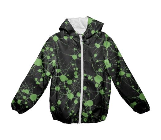 Kids rain jacket with a hood elastic sleeve cuffs & hem to keep out the rain and side pockets.
