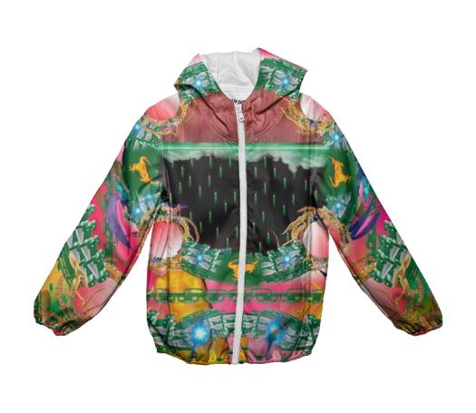Kids rain jacket with a hood elastic sleeve cuffs & hem to keep out the rain and side pockets.