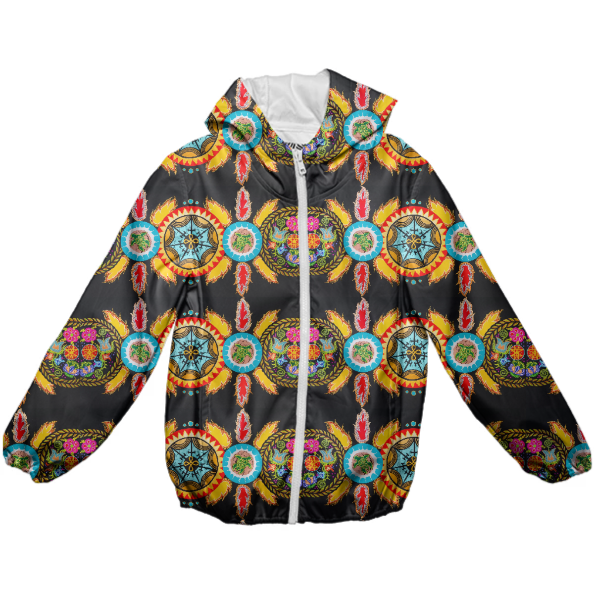 Kids rain jacket with a hood elastic sleeve cuffs & hem to keep out the rain and side pockets.