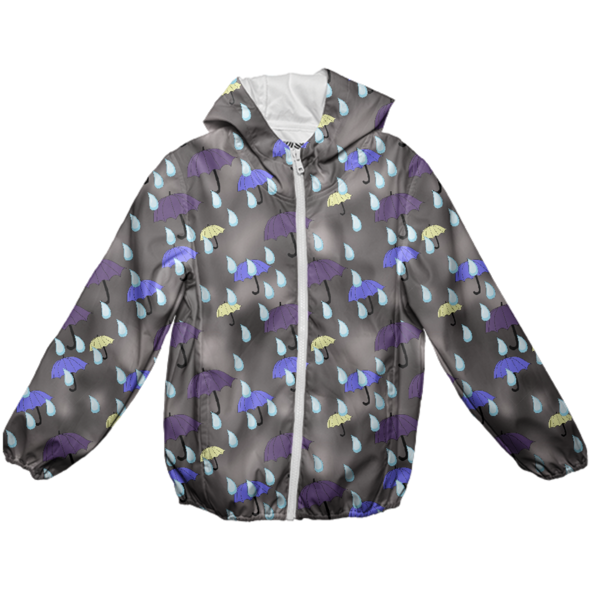 Kids rain jacket with a hood elastic sleeve cuffs & hem to keep out the rain and side pockets.
