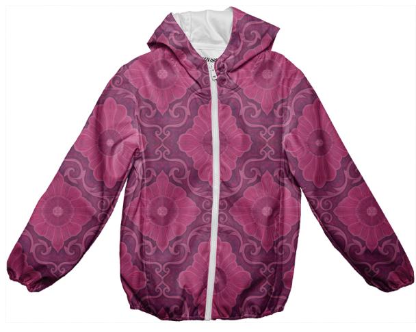 Kids rain jacket with a hood elastic sleeve cuffs & hem to keep out the rain and side pockets.