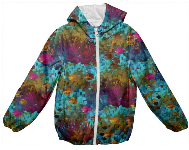 Kids rain jacket with a hood elastic sleeve cuffs & hem to keep out the rain and side pockets.