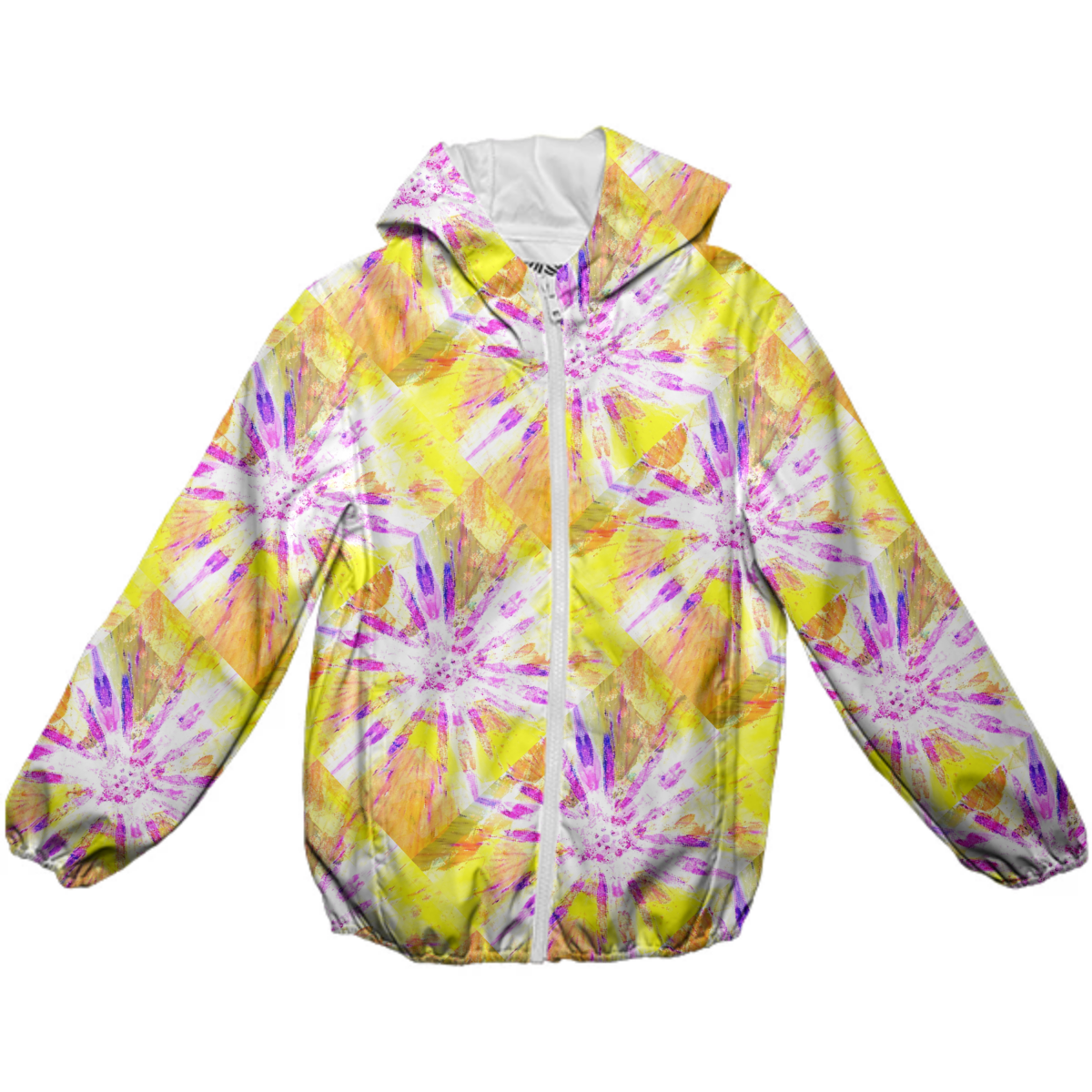 Kids rain jacket with a hood elastic sleeve cuffs & hem to keep out the rain and side pockets.