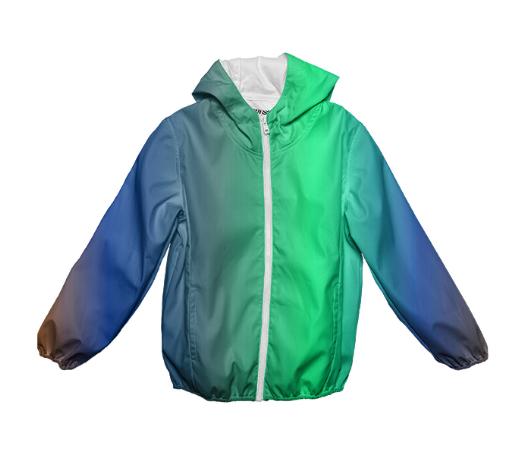 Kids rain jacket with a hood elastic sleeve cuffs & hem to keep out the rain and side pockets.