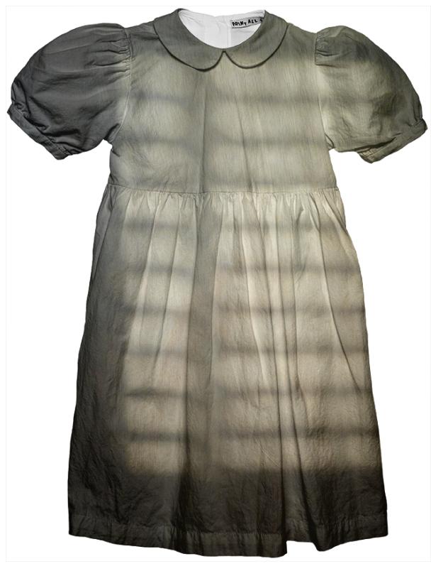 This kids party dress features a peter pan collar puff sleeves and empire waist with back bow tie. Easy to get on and off with center back plastic buttons.