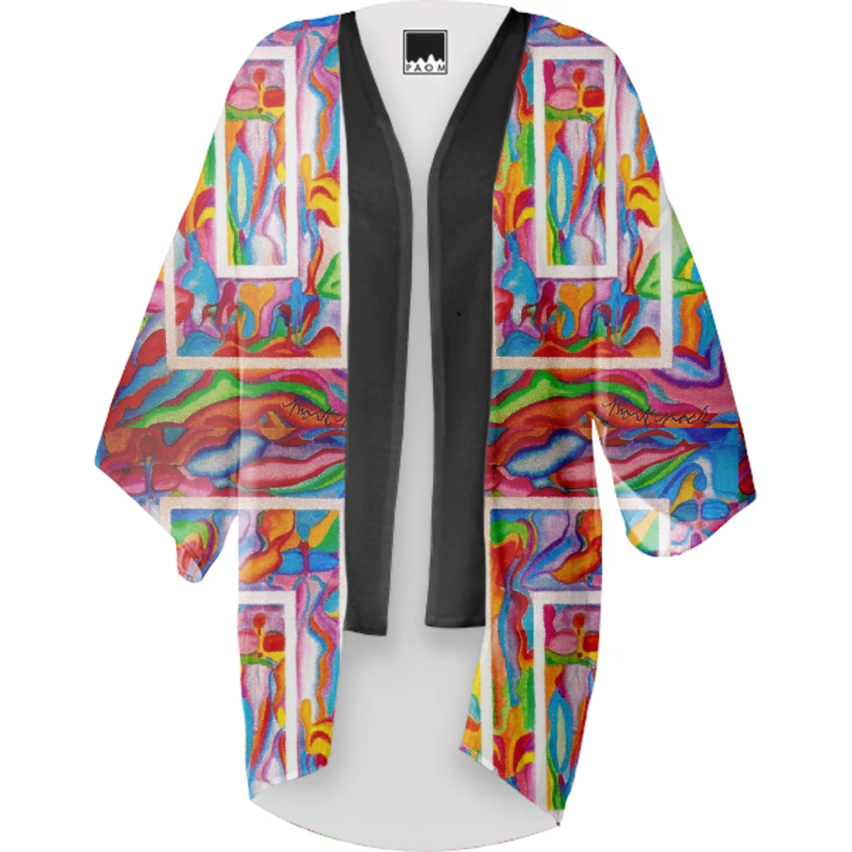 Flowy chiffon kimono falls nicely at mid thigh. Great for layering or using as a beach cover up.