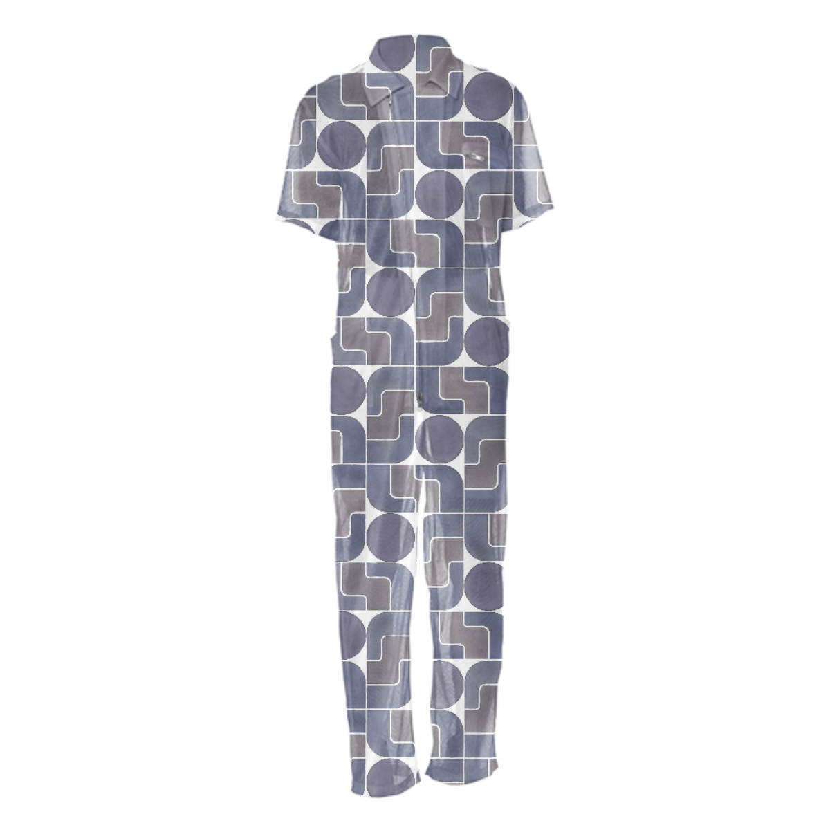 Loose fit jumpsuit in mesh with short sleeves front patch pockets at the hips and a zip up breast pocket. Double pull zipper at the front makes it easy to get on and off. The back features a slight elastic cinch at the waist. The uploaded file will be printed on the entire front and be mirrored on the back. Because of our cut and sew process some print elements on pockets seams and sleeves might not match up. For best results please upload a PNG or JPG with RGB color profile and dimensions of at least 40 inches width by 55 inches length. DPI can be as low as 72. Since every piece is custom made, it may take 2-4 weeks for delivery. Made in our studio (Shanghai).