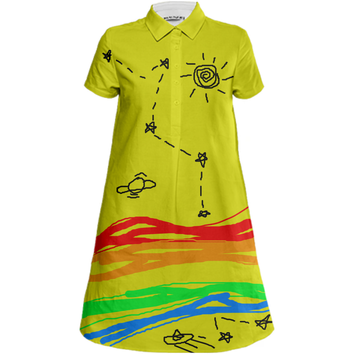 Sporty a-line collared mini dress with short sleeves a 5-button front placket and side seam pockets.