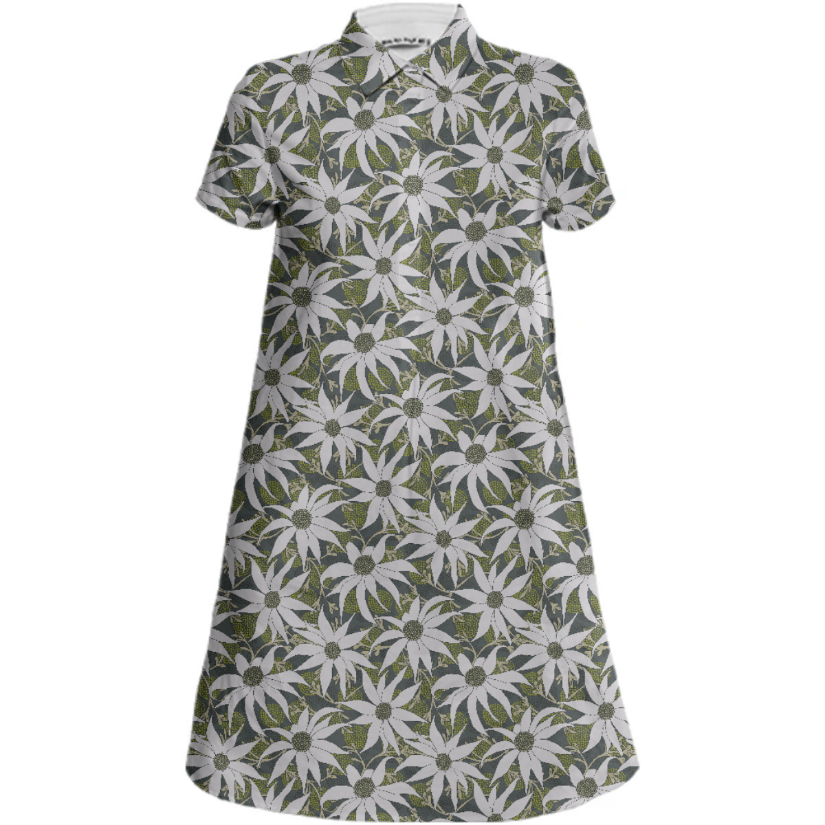 Sporty a-line collared mini dress with short sleeves a 5-button front placket and side seam pockets.