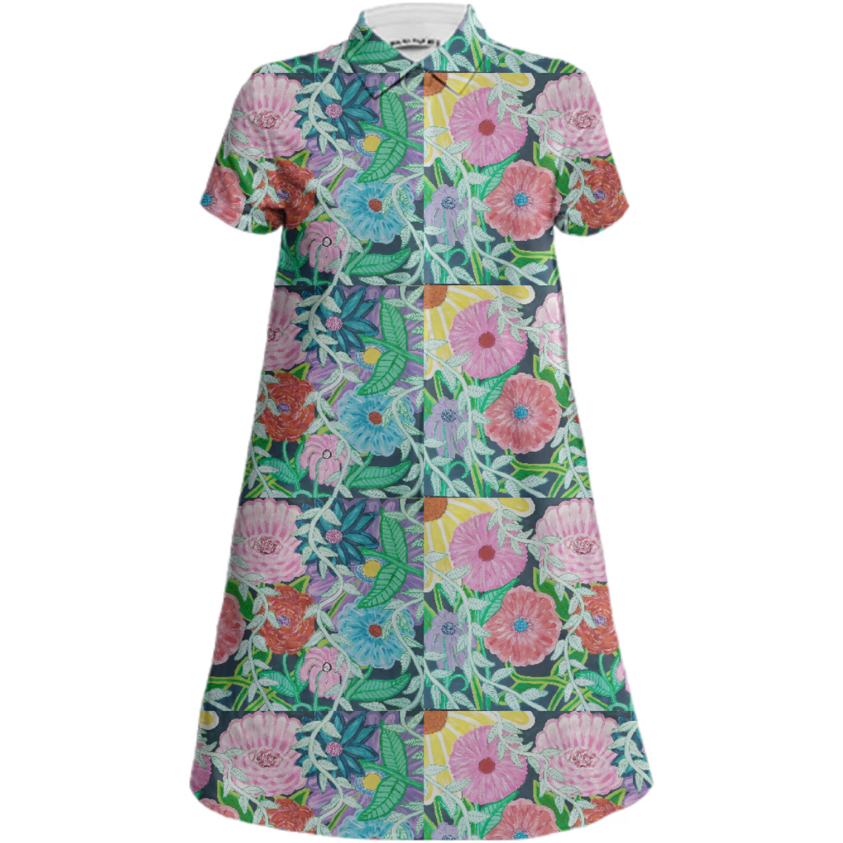 Sporty a-line collared mini dress with short sleeves a 5-button front placket and side seam pockets.