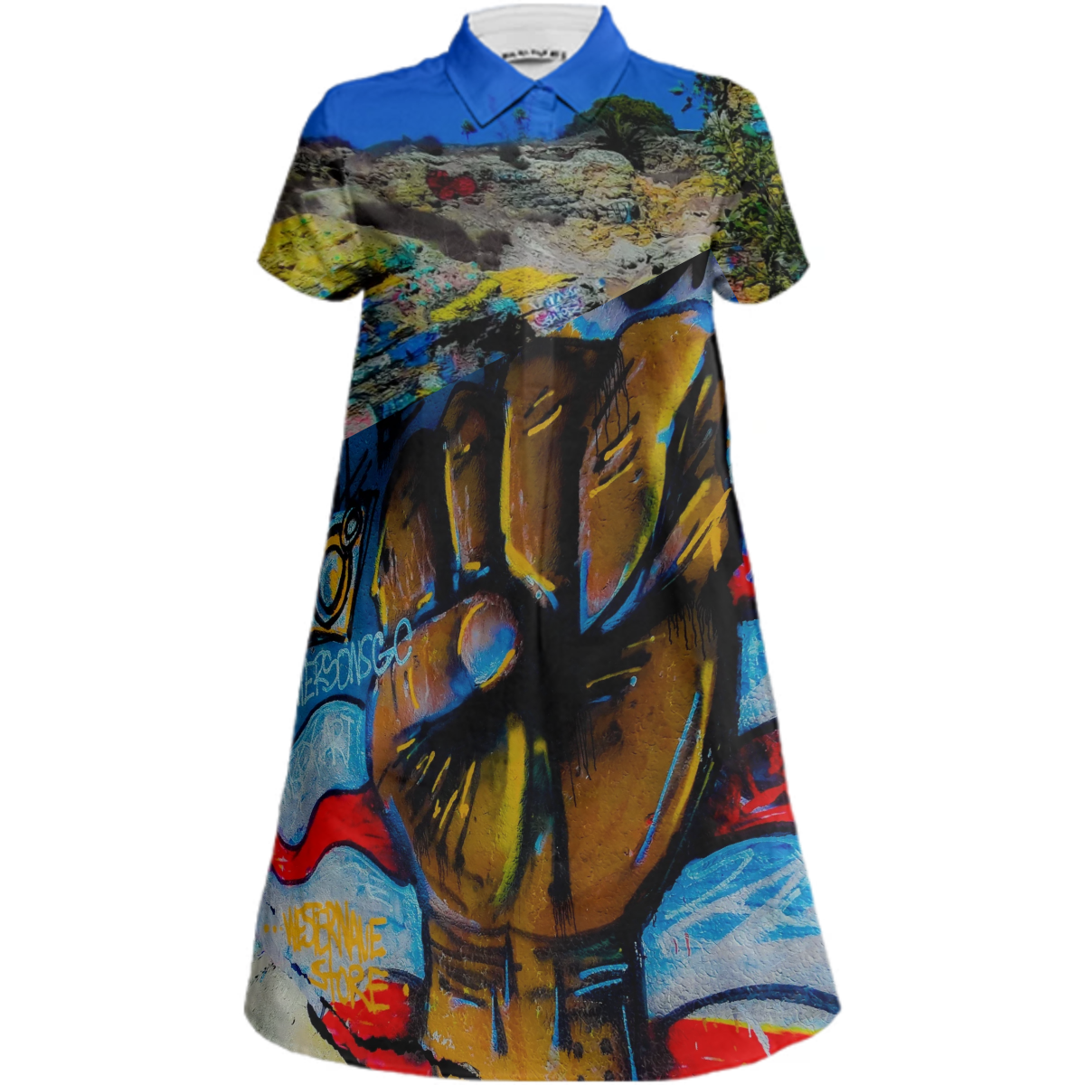 Sporty a-line collared mini dress with short sleeves a 5-button front placket and side seam pockets.