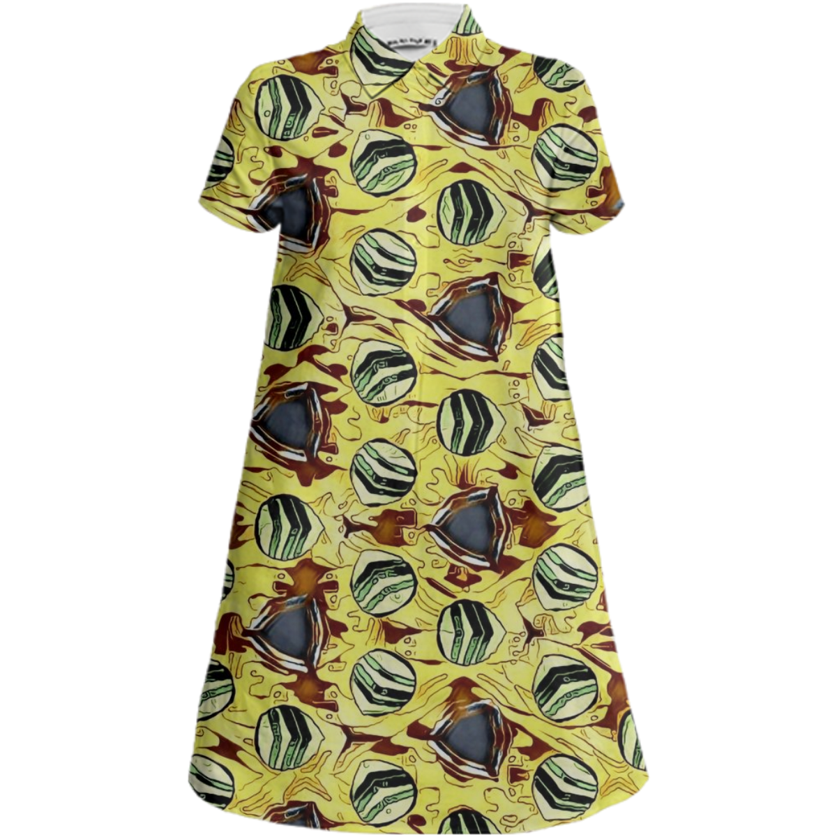 Sporty a-line collared mini dress with short sleeves a 5-button front placket and side seam pockets.