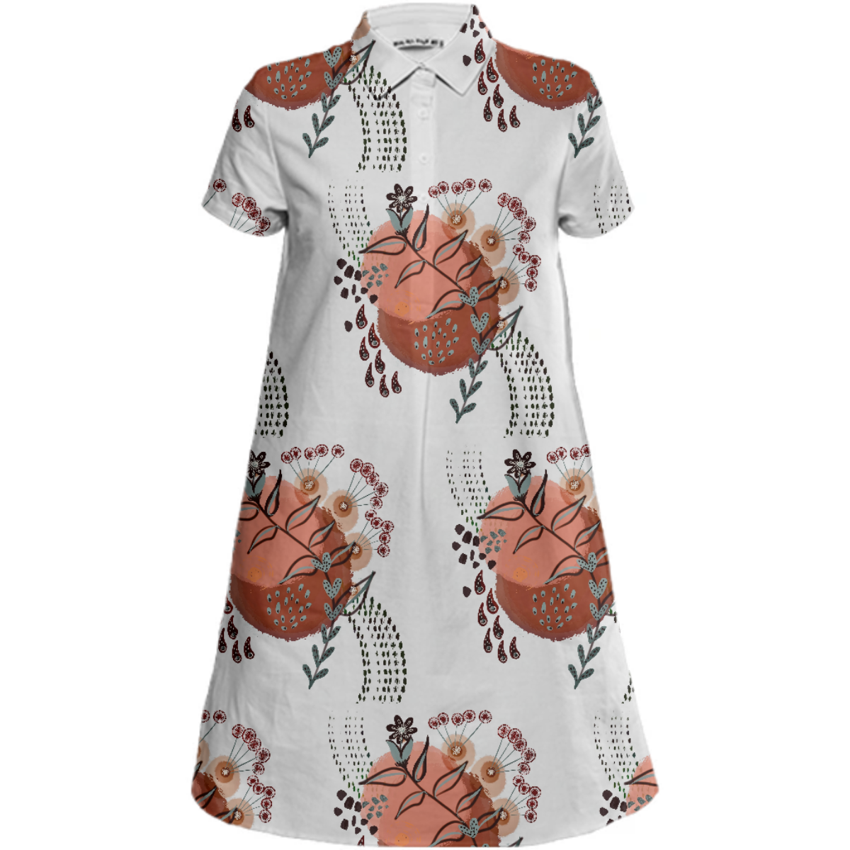 Sporty a-line collared mini dress with short sleeves a 5-button front placket and side seam pockets.