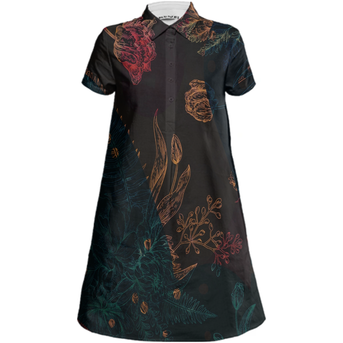 Sporty a-line collared mini dress with short sleeves a 5-button front placket and side seam pockets.