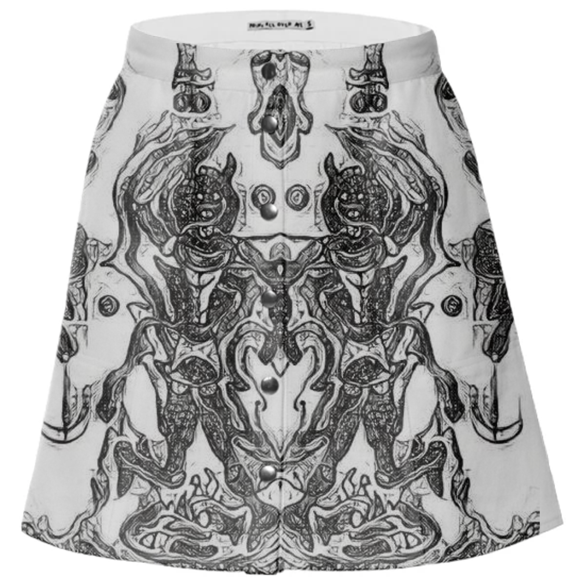 A-line mini skirt with tailored waistband front metal snap closures and rectangular patch pockets.