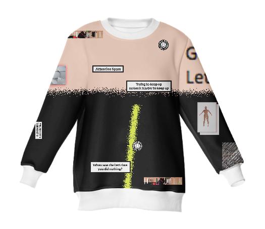 Bulky fitting neoprene sweatshirt with solid black or white neck cuff and waistband ribbing.